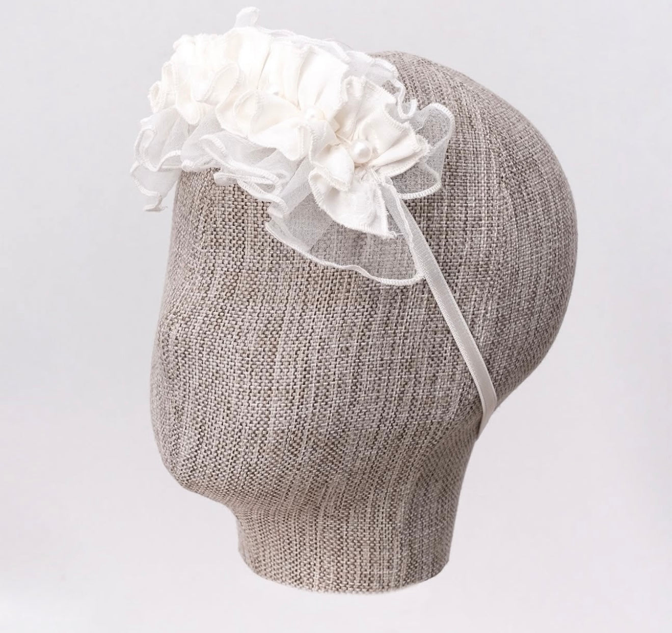 فستان مواليد باللون الأبيض الكلاسيكي، بتصميم أنثوي رقيق مزين بكشكش على الأكتاف وتفاصيل قطنية مطرزة تضيف لمسة من الأناقة. تنورة من التول الناعم تمنح إطلالة حالمة، مع وردة ساتان كبيرة مرصعة بكريستال في الوسط لمزيد من التميز. يأتي معه ربطة رأس مطابقة لإطلالة متكاملة مثالية للمناسبات الخاصة وحفلات استقبال المولود .